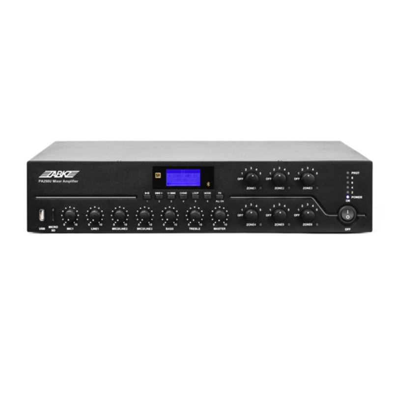 El ABK-PA PA250U es un amplificador mezclador digital de 250W nominal, diseñado para sistemas de megafonía profesional (Public Address). A diferencia de los modelos más básicos de la marca, este equipo destaca por su capacidad de gestión avanzada y su compatibilidad con accesorios de control remoto.