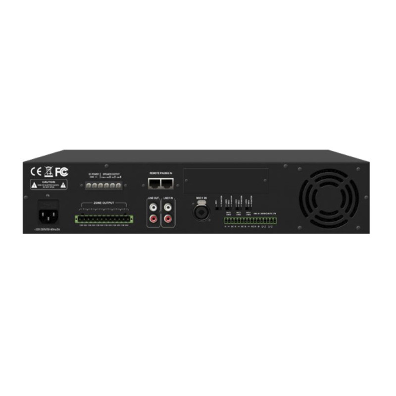 - Integración de Alarmas: Tiene entradas específicas para conectarse a paneles de incendio y silenciar la música automáticamente en caso de emergencia.
