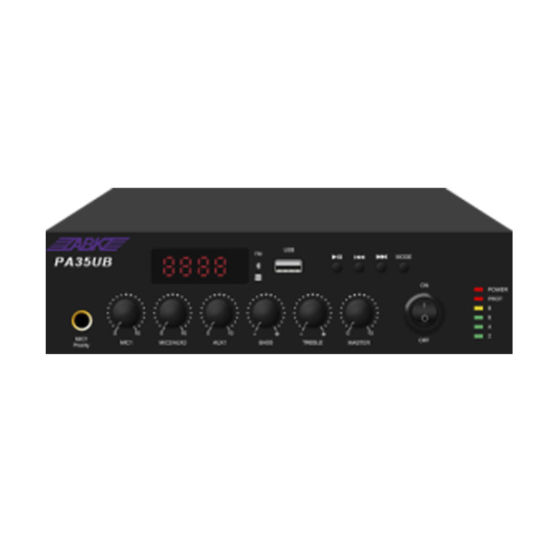 El PA35UB es un mini amplificador mezclador digital compacto de la marca ABK, es un equipo versátil diseñado para sistemas de megafonía pequeña o ambiental.