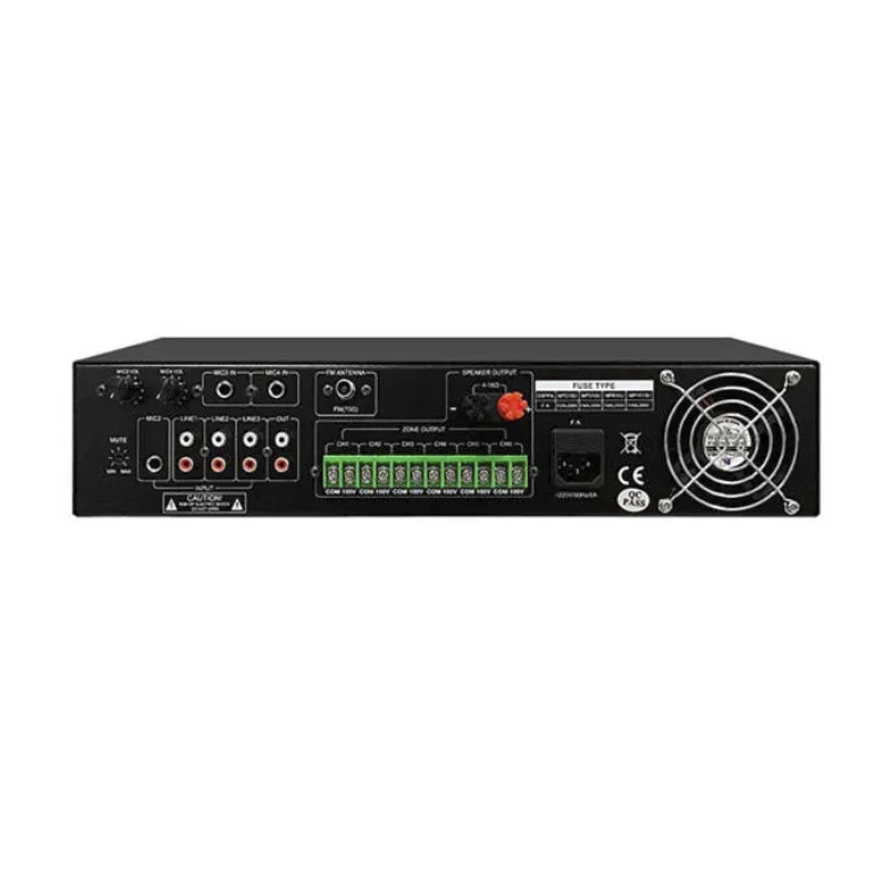 Amplificador Clase D de 6 zonas con potencia 120W - Entrada USB, SD, radio FM, 4 entradas MIC, alimentación Phantom y 3 entradas de linea AUX.