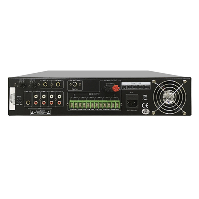 Amplificador Clase D de 6 zonas con Potencia 250W - Entrada USB, SD , Bluetooth 5.0 , radio FM, 4 entradas MIC, alimentación Phantom y 3 entradas AUX.