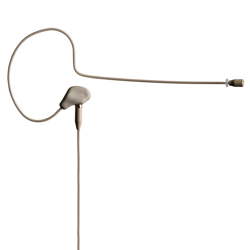 El C111 LP es un micrófono ultra ligero fabricado en acero inoxidable, diseñado para colocarse de forma segura tras la oreja. Su estructura es extremadamente delgada y de color beige (color carne), lo que lo hace casi invisible para la audiencia o las cámaras. A pesar de su apariencia frágil, está construido para ser robusto y fiable, permitiendo un ajuste perfecto a la cara del usuario gracias a su brazo flexible.