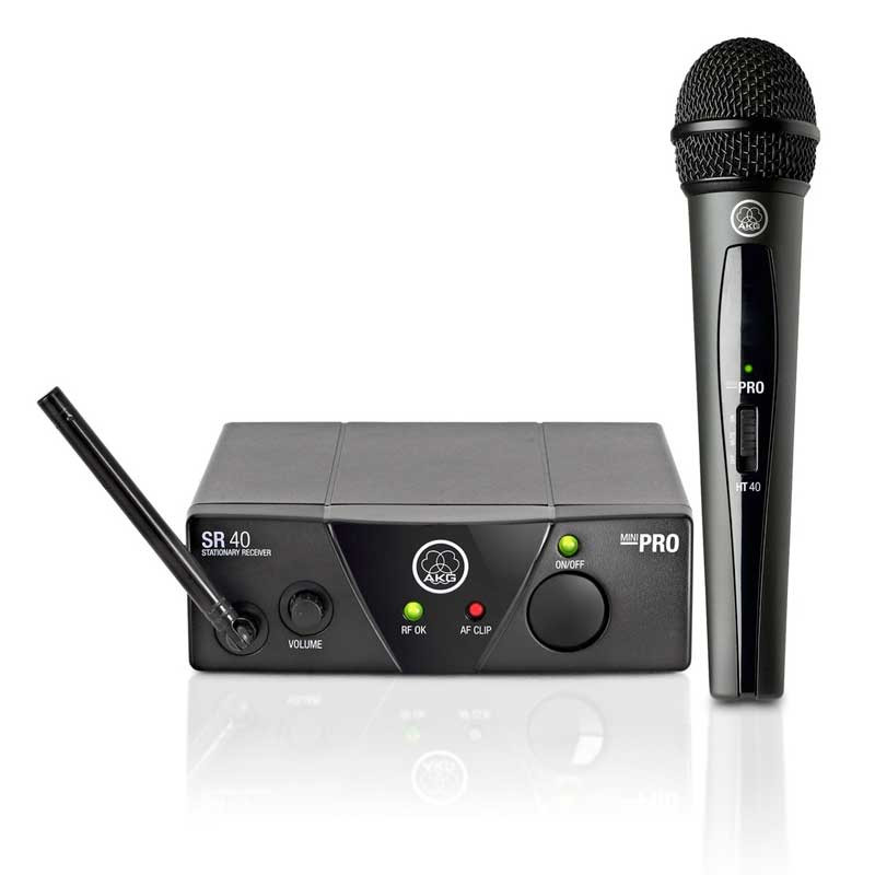 Sistema inalámbrico para vocalista en la banda UHF AKG ISM2 (864.375MHz) PLUG&PLAY, formado por un micrófono emisor de mano HT40, con interruptor con mute y on/off y un receptor de sobremesa AKG SR40 no diversity con antena delantera y salida con jack balanceado.