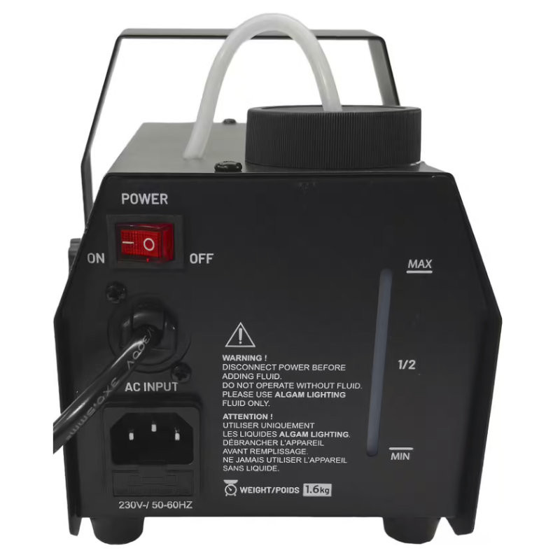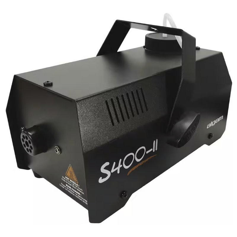 Máquina de humo Algam Lighting LAL S400 II ideal para fiestas, eventos o escenarios, con cuerpo calefactor de 400 W y tiempo de calentamiento de aproximadamente 4 minutos. Depósito de 250 ml con indicador de nivel, caudal de 50 m³/min y alcance del chorro de 3-4 m.