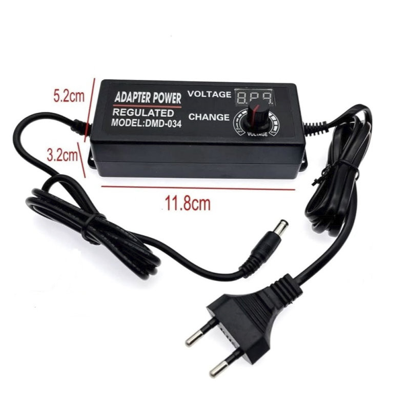 Alimentador/regulador de tensión DC ajustable que convierte la corriente alterna de la red eléctrica en tensión continua regulable entre 3 V y 24 V, con una corriente máxima de salida de 3 A y pantalla digital (display) para ver y ajustar con precisión los valores de salida. Es un tipo de fuente de alimentación con control de voltaje muy útil para electrónica, proyectos y equipos que requieren tensiones ajustables.