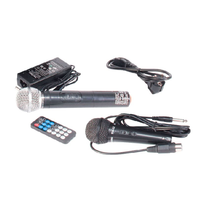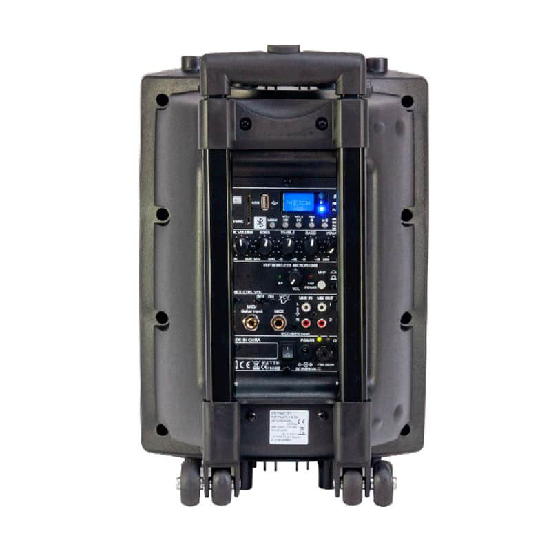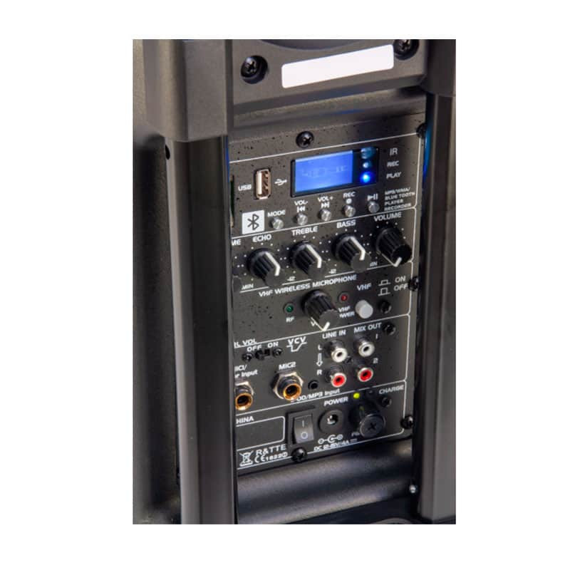 Altavoz portátil con woofer de 8 pulgadas con tecnología Bluetooth y reproductor de MP3 por puerto USB además de función de grabación (REC) que incluye 2 micrófonos, uno de mano inalámbrico VHF con un alcance de 10 metros en interiores y otro con cable. Además incorpora sistema trolley con ruedas para un mejor transporte.