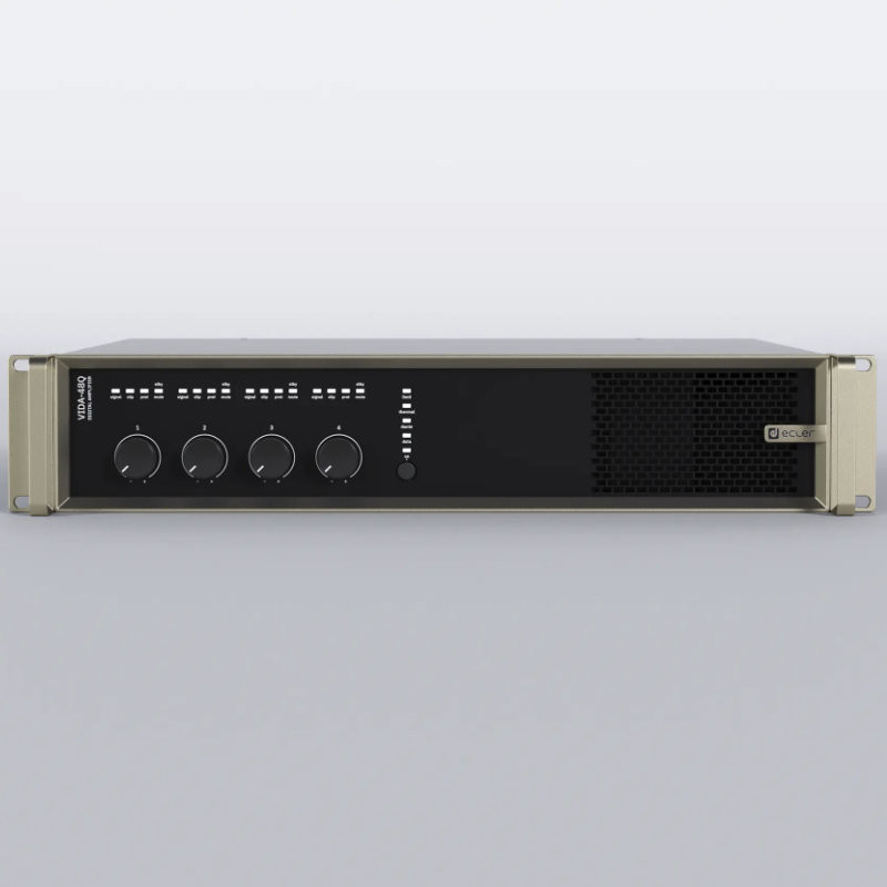 El VIDA-48Q es un amplificador digital de 4800W, con 4 salidas amplificadas que pueden ser configuradas independientemente en alta (100/70V) o baja (8/4/2ohm) impedancia. La tecnología VersaPower, desarrollada por Ecler, permite un reparto asimétrico de la potencia, y gracias a la herramienta Smart VersaPower, ofrece un ajuste inteligente y rápido a los instaladores.