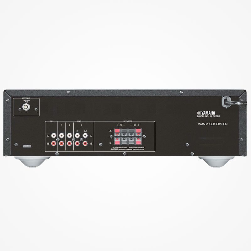 En la parte trasera encontramos los conectores de audio. El Yamaha R-S202D cuenta con dos canales que consiguen una potencia de 100W por canal a 8 ohmios. Yamaha se ha esforzado para reducir al mínimo la longitud de las rutas de señal y optimizar el diseño del circuito. El transformador de potencia se ha posicionado cerca del circuito amplificador de potencia para reducir la pérdida de energía y mejorar la capacidad de potencia pico de suministro. Esto permite una salida de alto volumen.