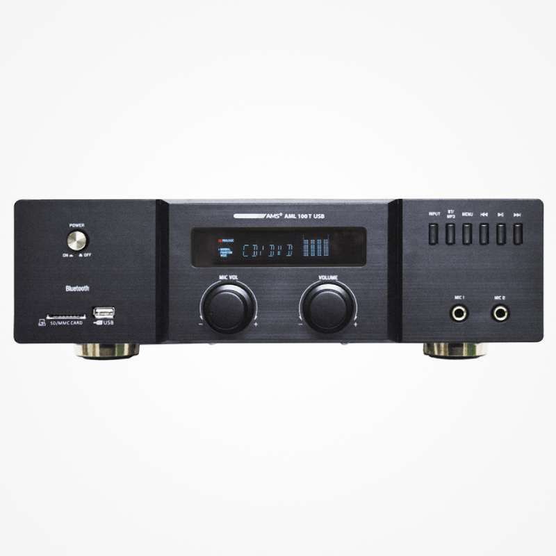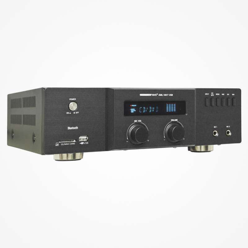 El AML 100 T USB es un amplificador estéreo de instalación. Incluye 4 fuentes de entrada (2 LINE + 2 MIC). La unidad incorpora una interfaz USB/SD para archivos de audio externos, así como conectividad Bluetooth. Por lo tanto, es posible enviar archivos de audio desde un smartphone o dispositivo similar. Incorpora una pantalla de gran formato que muestra la información de la pista reproducida, modo de funcionamiento y vúmetro. La variedad de tipos de fuentes de audio lo hacen muy adecuado para un gran número de instalaciones: oficinas (como música de fondo y avisos), escuelas, tiendas o salas de conferencias.