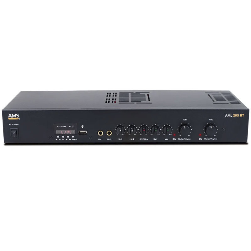 El AMS AML 265 BT es un amplificador de 2 canales que puede operar tanto en baja impedancia (4-16 Ohm) como L100V. Incluye 3 canales de entrada (1AUX + 2 MIC),corpora una interfaz USB/SD/FM para archivos de audio externos, así como conectividad Bluetooth, siendo posible enviar archivos de audio desde un smartphone o dispositivo similar. La pantalla muestra toda la información de pista, modo de funcionamiento, nivel de volumen, número de pista o tiempo transcurrido. Incluye 2 controles de tono y alimentación de emergencia 12V DC.