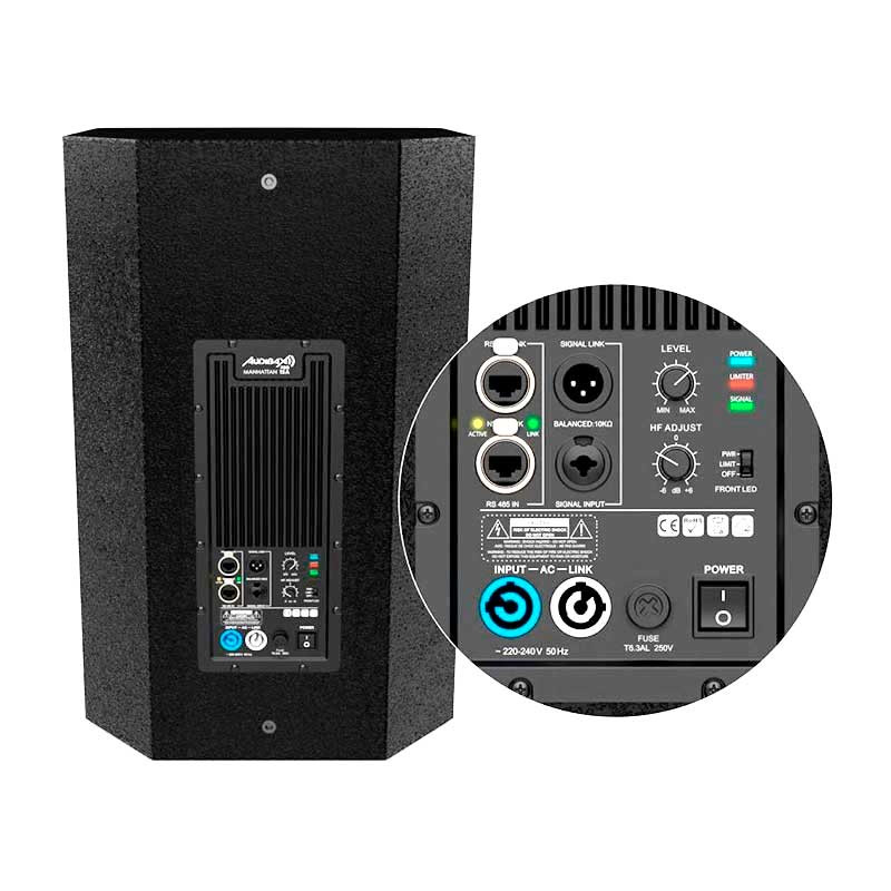 El Audibax Pro Manhattan 15A es un altavoz activo de PA de 2 vías con una potencia de 1500W RMS. Tiene un driver de woofer de 15 pulgadas con una bobina móvil de 3 pulgadas. El controlador de altas frecuencias (HF) es de tipo bocina, con un transductor de 1,75 pulgadas y una bobina móvil de 4,5 pulgadas.