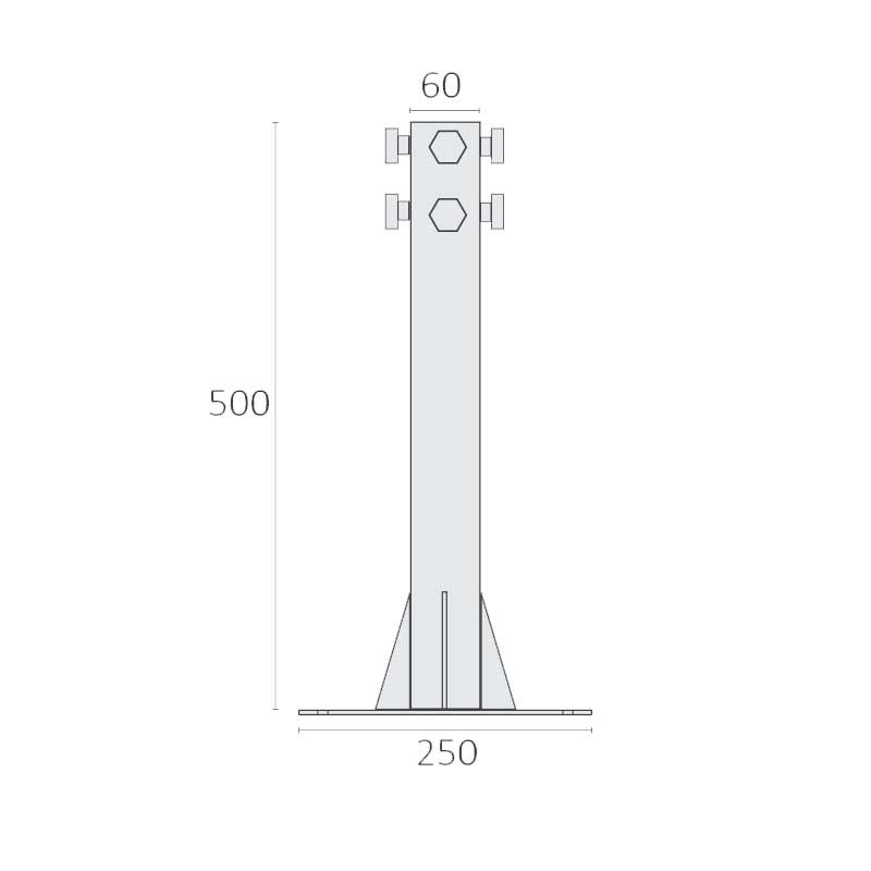 Soporte suelo para mástil de hasta 50mm. Placa base de 250 x 250mm. Poste de 500mm. Fijación por tornillos.