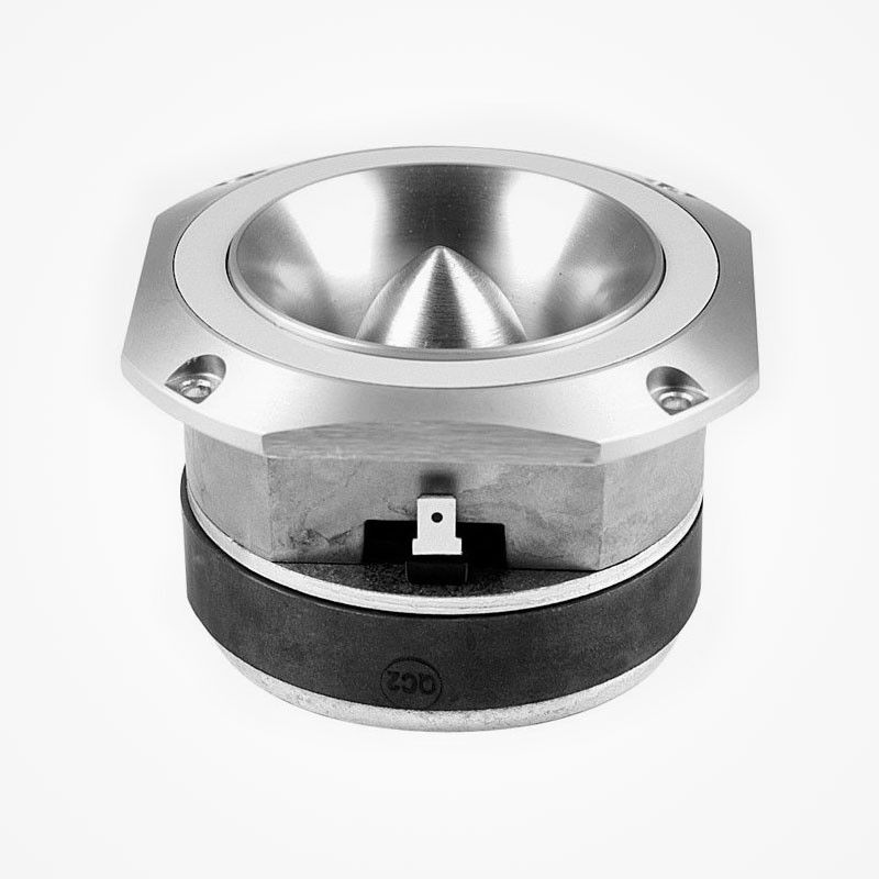 Tweeter de compresión para aplicaciones de gran alcance. Bobina de 1.5" (37.6 mm.) de hilo plano de aluminio. Importante potencia admisible: 25 w. AES. Potencia programa 50 w. Diafragma de aluminio. Ajustada directividad: 40º cónica. Concebido para aplicaciones que precisen presión elevada en alta frecuencia a grandes distancias. Impedancia nominal 8 ohms. Impedancia mínima 8.5 ohms.@ 9 kHz. Resistencia eléctrica 6.1 ohms. Sensibilidad 107 dB 1w @ 1m. Rango de frecuencias 4-20 kHz. Frecuencia de corte recomendada 5 kHz. or higher. Dispersión H x V 40° conical. Diámetro nominal 37.6 mm. 1.5 in. Peso conjunto magnético 1.2 kg. 2.64 Ib. Densidad de flujo 1.55 T. Factor BL 5.2 N/A.