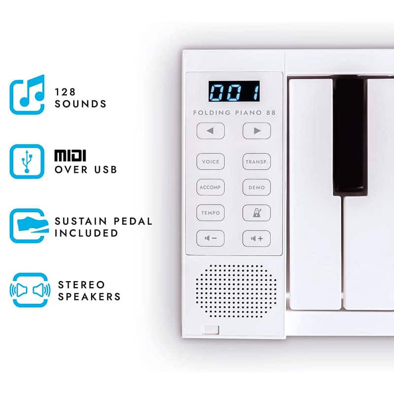 Piano digital plegable de 88 teclas -Midi USB. Altavoces incorporados 2x2W. Polifonia 128 voces. 30 canciones Demo. Tempo. Conexion Pedal Sustain.
