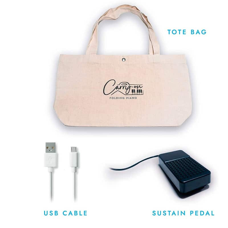- Elementos incluidos: pedal de sustain, bolsa Tote bag, cable de carga USB