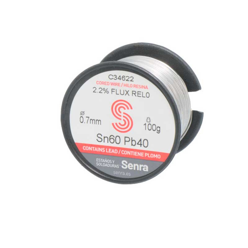 Bobina de estaño 0,7mm., estaño Sn60%, plomo Pb40%, Flux 2.2% ROL0. Peso 100 gramos.