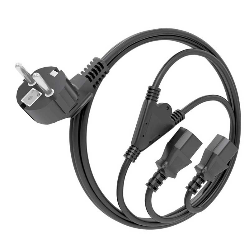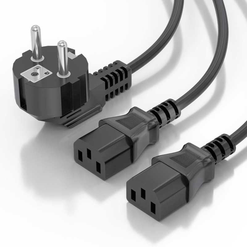 Cable de alimentación para CPU con conector CEE7 macho en un extremo y dos conectores C13 hembra en los otros. Este cable es ideal para conectar dos dispositivos (dos monitores) a una toma de corriente. Fabricado con conductor 100% cobre para dispositivo con consumo inferior a 1500W.