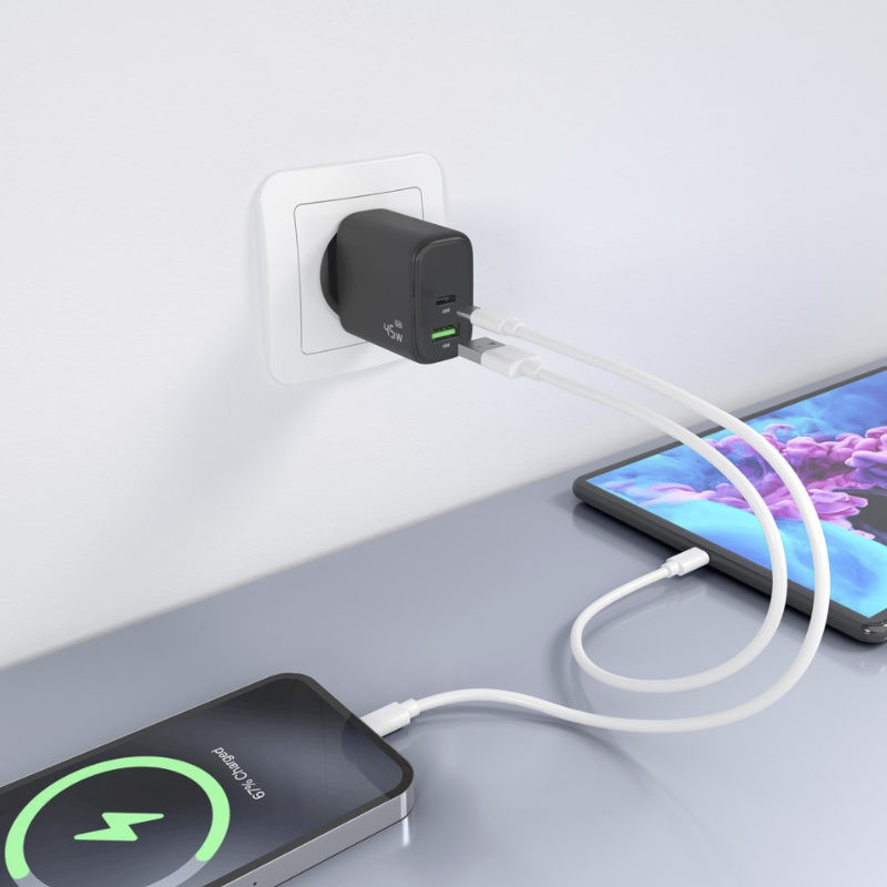 Cargador GaN 45W, 1xUSB-C PD3.0 QC4.0, 1xUSB-A QC3.0. Negro.