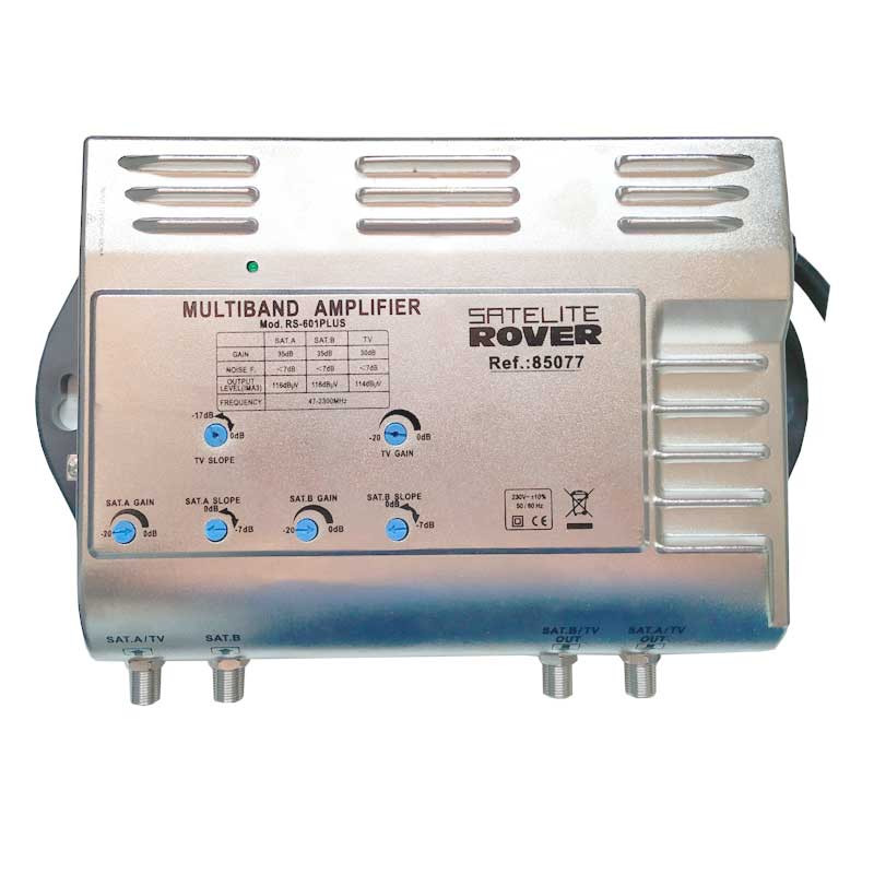 Central multibanda 2 entradas, 2 salidas. frecuencias 47 - 2150 MHz. Ganancia TV: 30 dB, SAT A: 35 dB, SAT B: 35 dB.