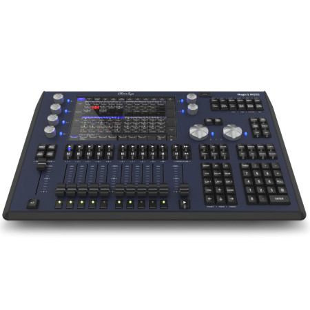 La consola integra una pantalla táctil de 10.1 pulgadas que es el centro neurálgico de la programación. El software MagicQ permite trabajar con el visualizador MagicVis integrado, lo que significa que puedes diseñar y parchear tus 8 universos en un entorno 3D antes de llegar al montaje real. Además, la función de Plot de Luces permite seleccionar los aparatos de forma visual sobre un plano 2D, agilizando enormemente el trabajo con grandes cantidades de luminarias.
