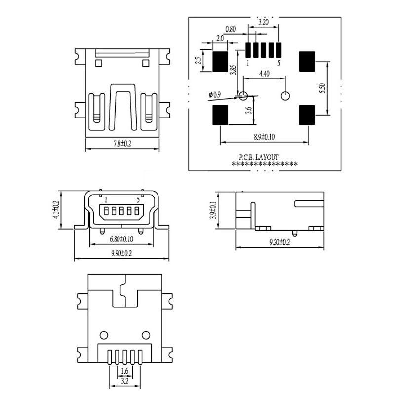 Conector Mini USB 5P hembra tipo B para Circuito Impreso recto SMD.