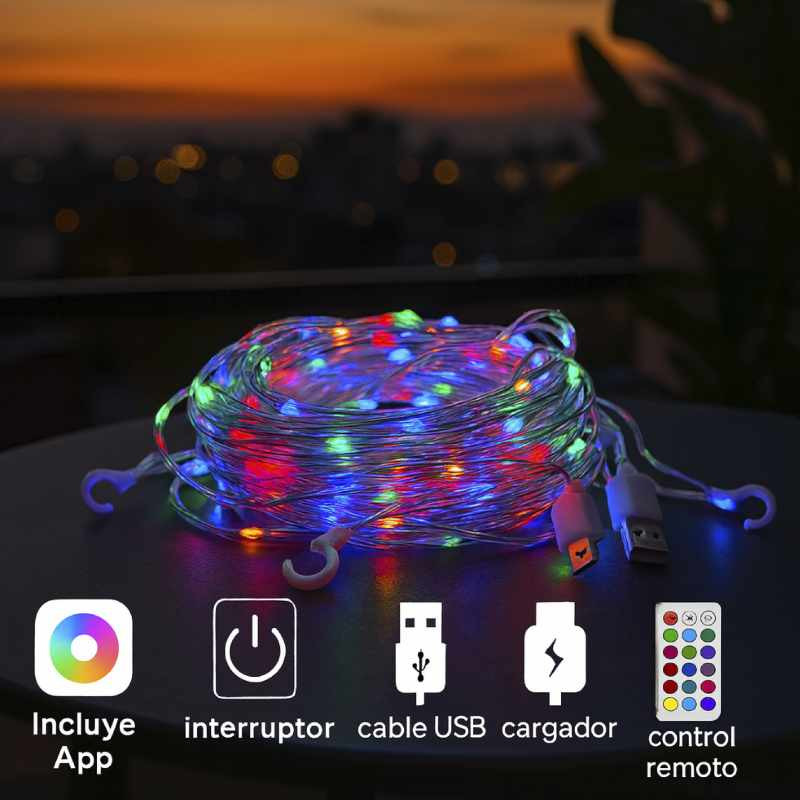 Controla tu iluminación como prefieras: desde la app, con interruptor físico o mediante el control remoto incluido. Esta guirnalda LED multicolor es compatible con USB e incluye cargador. Perfecta para crear atmósferas personalizadas en segundos, ideal para balcones, ventanas o interiores modernos.