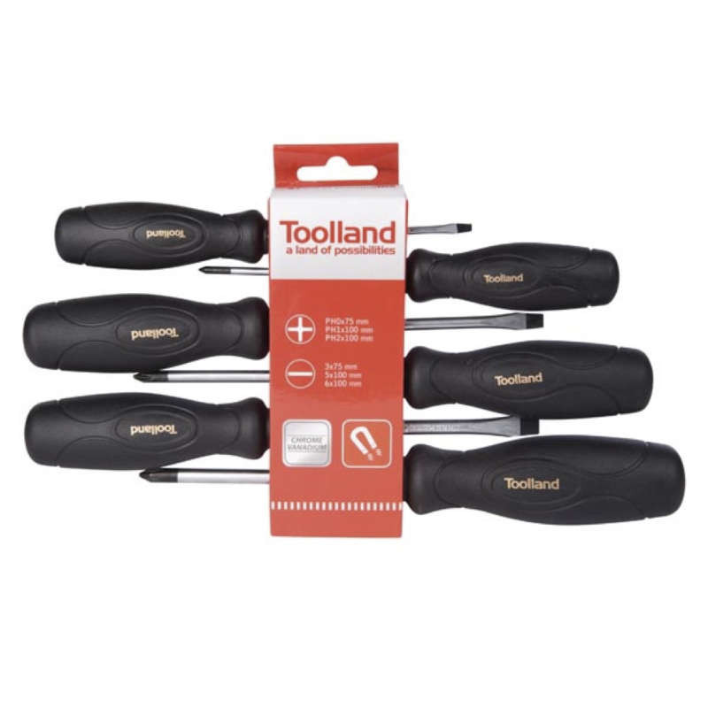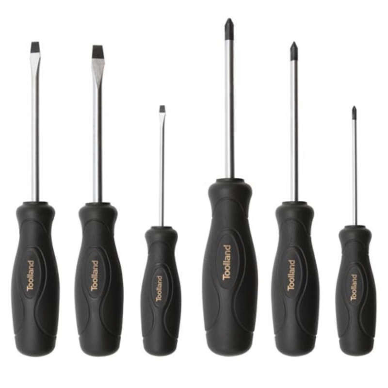- Conjunto de 6 destornilladores: 3 de punta plana y 3 Phillips.