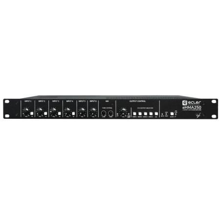 El Ecler eHMA250 es un mezclador de audio auto-amplificado (amplificador-mezclador) diseñado para instalaciones de sonido profesional en entornos comerciales, corporativos y de ocio, donde se necesita mezclar varias fuentes de audio y amplificar la señal a altavoces con versatilidad y fiabilidad.