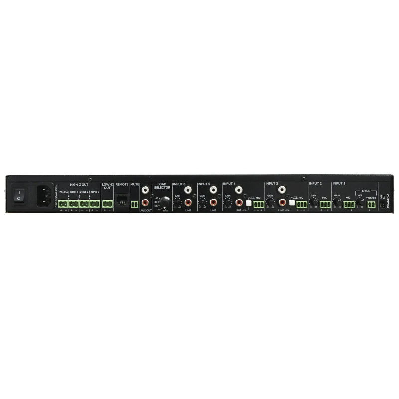 - Flexibilidad en sistemas de sonido distribuido: con salidas de baja y alta impedancia y control por zonas, apto para instalaciones de megafonía y audio ambiental.