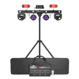 Sistema de iluminación 5 en 1 que incluye cabezas móviles, derbies, washes, láser y efecto estroboscópico premontados en una sola barra.