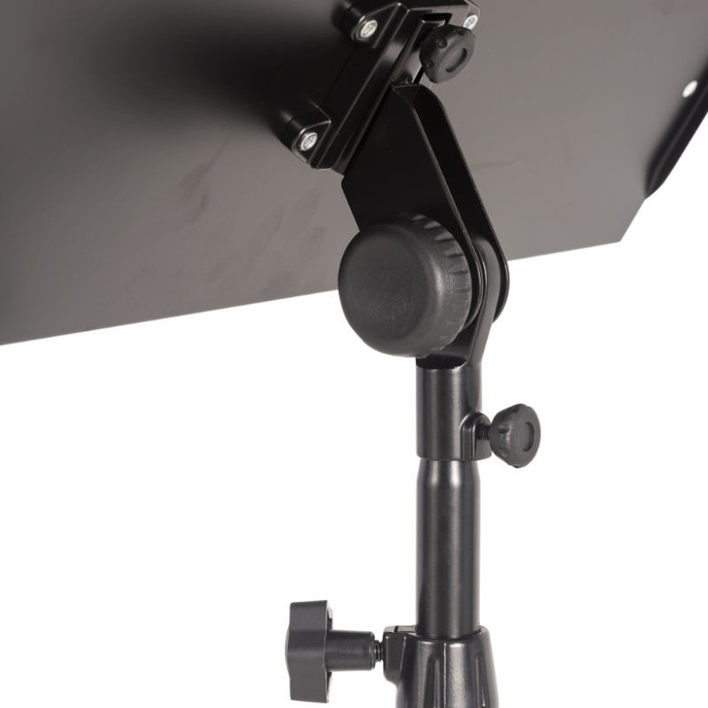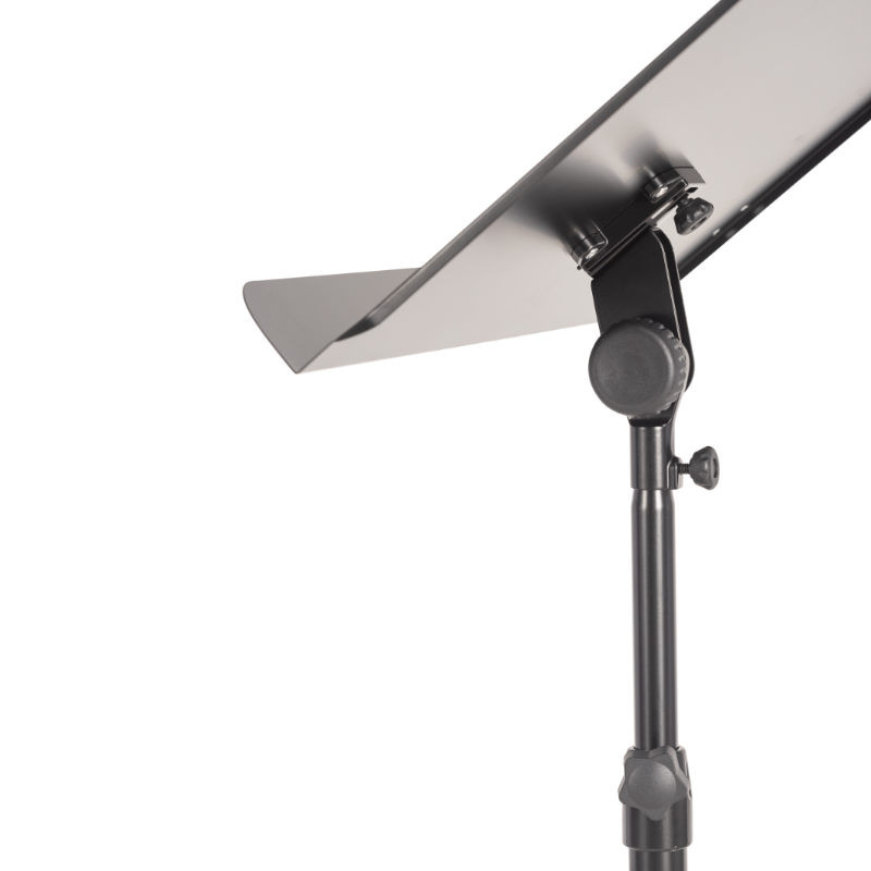 Fabricado con materiales resistentes y un elegante acabado en negro mate, el MUS026 combina una estética sobria y profesional con una estructura reforzada. Su sistema de ajuste de altura permite una personalización total, adaptándose tanto a directores que prefieren trabajar de pie como sentados, garantizando siempre un ángulo de visión óptimo.