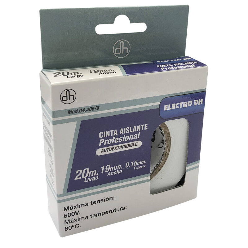 Cinta aislante de PVC, profesional, autoextinguible. Longitud 20 metros. Anchura 19mm. Espesor 0.15mm.