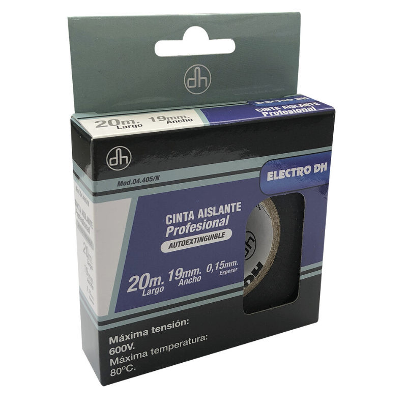 Cinta aislante de PVC, profesional, autoextinguible. Longitud 20 metros. Anchura 19mm. Espesor 0.15mm.