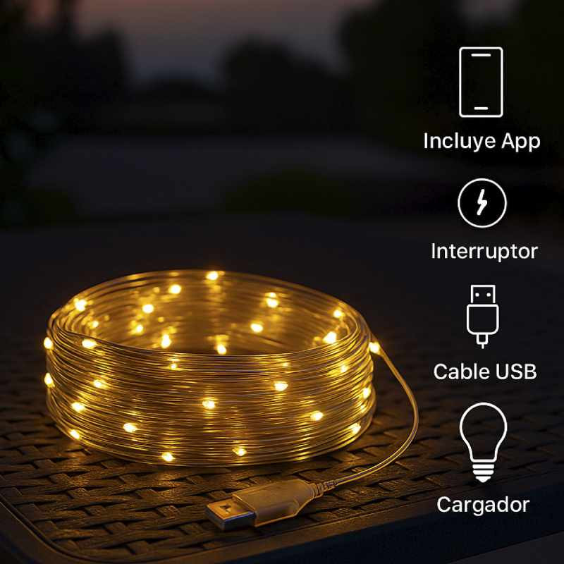 La guirnalda incluye todo lo necesario para una instalación sencilla: cable USB, cargador y ganchos integrados. Además, es compatible con control mediante aplicación móvil para que puedas regular la luz fácilmente desde tu smartphone, creando el ambiente ideal en segundos.
