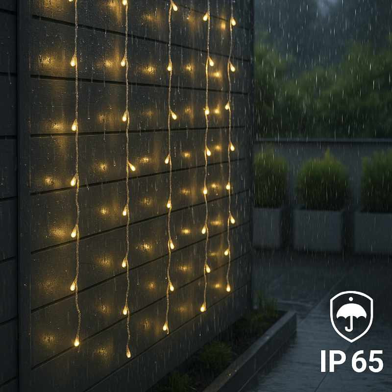 Ilumina y decora con estilo usando esta cortina de luces LED cálidas de 3x2 metros, perfecta para ambientes interiores o exteriores gracias a su protección IP65 contra agua y polvo. Con un consumo eficiente de solo 3W y una vida útil de 15.000 horas, es ideal para crear atmósferas acogedoras en terrazas, balcones, ventanas, fiestas o decoraciones permanentes.