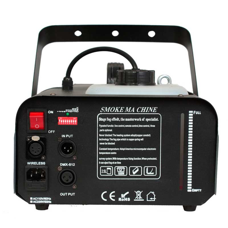 Máquina de humo vertical con Led RGB, 2 grupos separados de LED RGB de 6 x 3W cada uno. Potencia 1000W. Capacidad del deposito 1.2 Litros