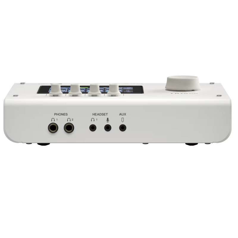 Interfaz de sonido USB-C con 4 entradas y 2 salidas, soporte de 32 bits/192 kHz, panel LCD táctil, mezcla/efectos con DSP.