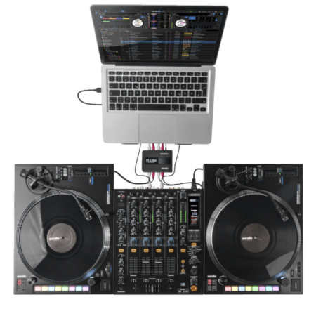 Interfaz DVS ultracompacta para Serato DJ Pro. Entradas y salidas estéreo duales, alimentación y transmisión de audio mediante USB-C.