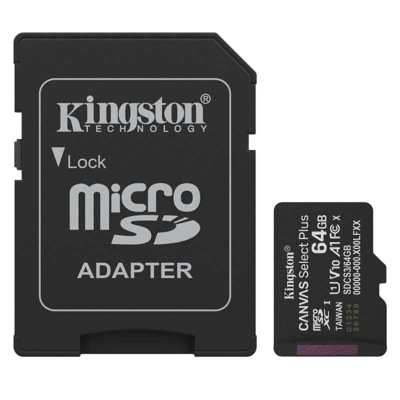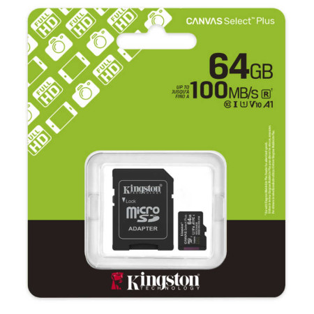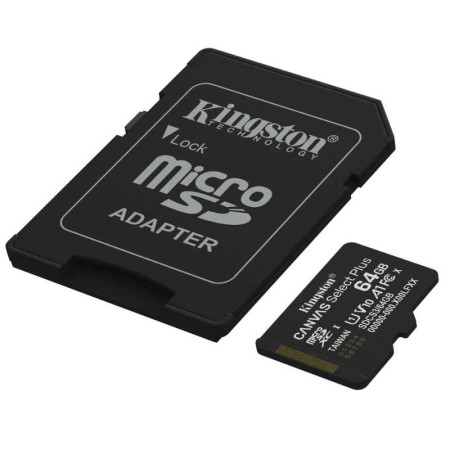 Tarjeta Canvas Select Plus MicroSD 64GB + adaptador, UHS-I, U1/U3 CLASS 10, hasta 150 MB/s en lectura. Categoría de vídeo 10/30, A1.