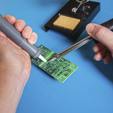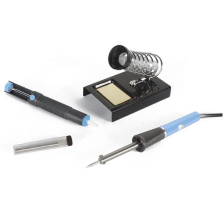 Kit de soldadura. El kit incluye: Soldador de 25W, Bomba desoldadora, Soporte de soldador y Estaño.