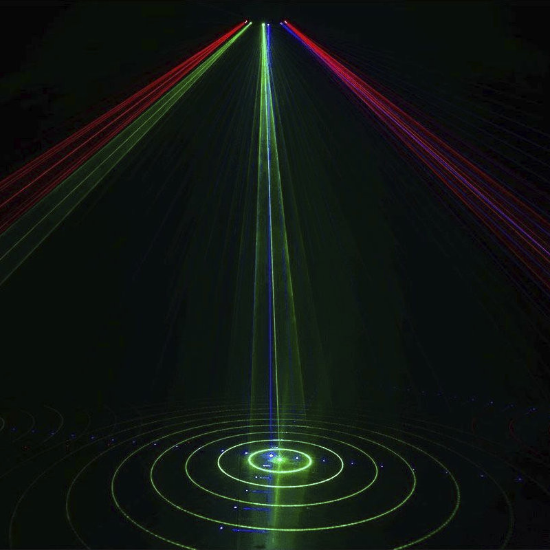 - Combina cuatro fuentes luminosas para un espectáculo de colores vibrante: dos láseres rojos de 100mW/650nm, un láser verde de 60mW/520nm y un láser azul de 100mW/450nm.