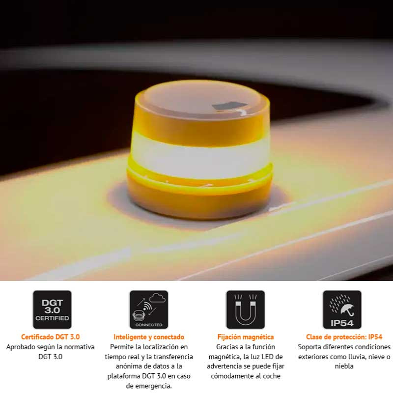 Luz LED de advertencia GEOLOCALIZADA magnética homologada por la DGT. 140 lúmenes. Certificación: DGT, CE, UKCA. Tarjeta SIM integrada.