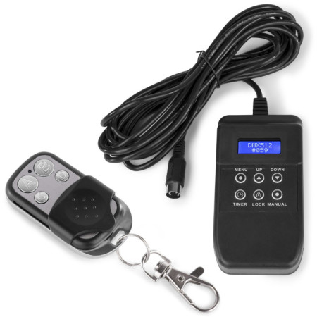 Máquina de humo horizontal y vertical de 1800W. con 24x 4W 4-en-1 LEDs. Volumen aprox. 350m3. DMX. Mando a distancia inalambrico y por cable.