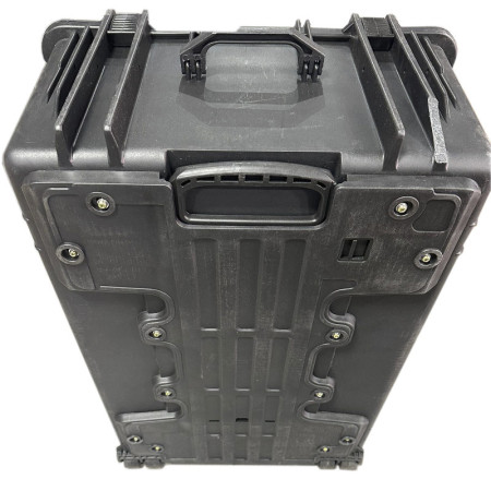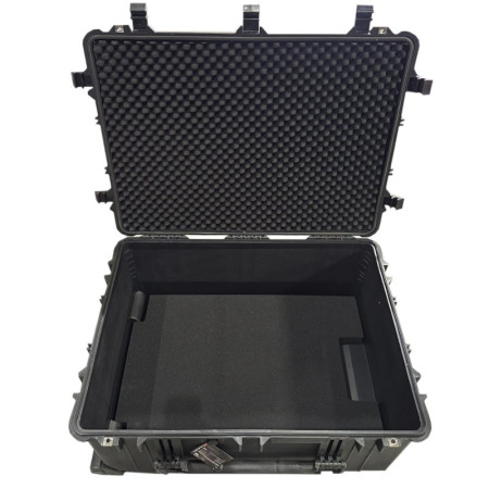 Flight Case rigida fabricada en ABS y espuma en su interior. Con ruedas y asa para su transporte. Dimensiones 790 x 595 x 365 mm.