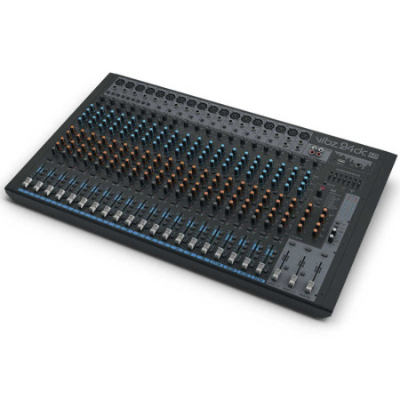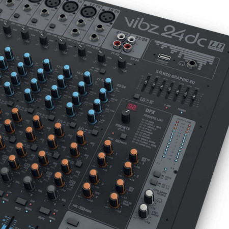 El LD Systems VIBZ 24 DC es una mesa de mezclas analógica de 24 canales con efectos digitales y compresor integrado, diseñada para mezclar, procesar y controlar señales de audio en aplicaciones de sonido en vivo, estudios caseros y sistemas de PA (Public Address). Es uno de los modelos de gama más alta de la serie VIBZ, pensada para músicos, DJs y técnicos de sonido que necesitan un control completo sobre múltiples entradas de audio.