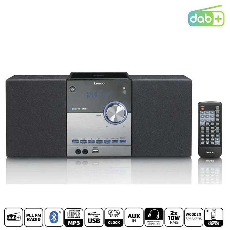 Micro set con DAB+/FM CD/MP3 Bluetooth USB. Radio FM PLL. Potencia de salida: 2 x 10 vatios (RMS). Mando a distancia Negro