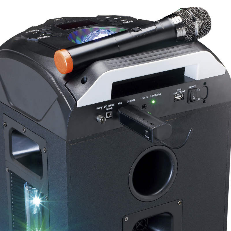 Set de micrófono inalámbrico dinámico diseñado para ofrecer libertad de movimiento en presentaciones, karaoke o eventos pequeños sin la complicación de cables largos. El sistema se compone de un micrófono de mano y un receptor compacto que se conecta directamente a una entrada de audio de 6,35 mm (Jack). La gran ventaja de este modelo es que tanto el micrófono como el receptor funcionan con pilas, lo que lo hace totalmente independiente de enchufes de pared, ideal para usar con altavoces portátiles en exteriores o lugares sin toma de corriente.