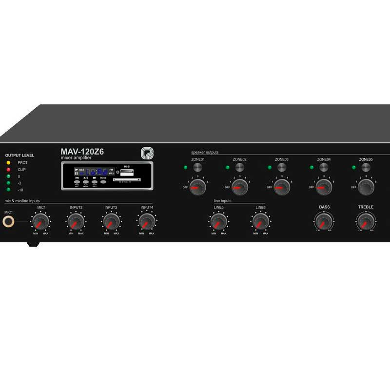 Amplificador con seis salidas de altavoces en linea de 100V con volumen independiente, que incorpora seis entradas de audio generales, una entrada de emergencia y una entrada para microfónicos de zonas. Dispone de una fuente musical con MP3 via UBS y SD, radio FM y Bluetooth. Incluye circuitos de protección contra sobretensión, cortocircuito, sobrecarga y alta temperatura, e indicadores LED de potencia, señal, pico y protección. Alimentación 110 ∼ 230 Vca 50∼60 Hz / 24 Vcc.