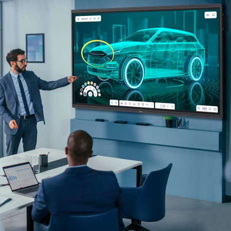Finalmente, el diseño de la 5863RK Serie 5 Gen3 integra un potente sistema de audio frontal que asegura una cobertura acústica clara en salas de gran tamaño, evitando la necesidad de instalar altavoces externos. Con su marco ultra delgado y su estética elegante, este panel de 86 pulgadas no solo es una herramienta tecnológica de primer nivel, sino también un elemento que aporta modernidad y profesionalidad a cualquier sala de juntas de alto nivel o auditorio universitario.