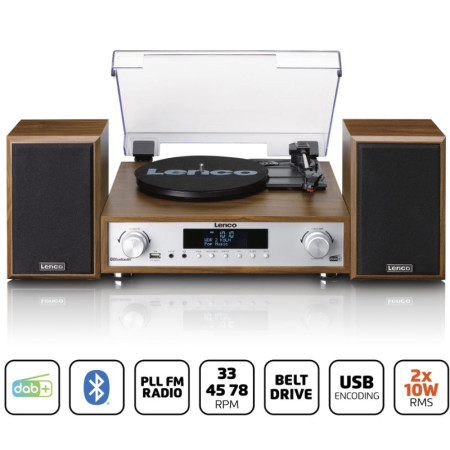 Equipo de música HiFi con tocadiscos, radio DAB+/FM y Bluetooth. Potencia: 2X10W.. Configuraciones de 33, 45 y 78 rpm de velocidad. Color Madera.